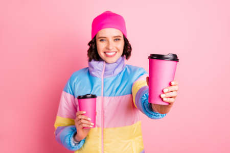 Portrait of her she nice attractive cheerful cheery girl holding in hands two take-out cups of green herbal tea giving to you isolated over pink pastel background