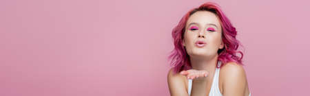 young woman with colorful hair blowing kiss isolated on pink, panoramic shot