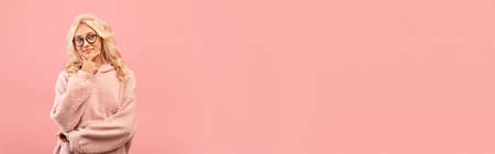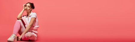 Beautiful attractive stylish woman posing isolated on pink background, banner, panorama, copy space