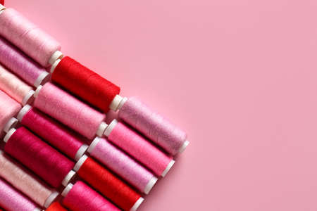 Glass jar full of clothing pink buttons and threads on white background. Sewing and craft concept.