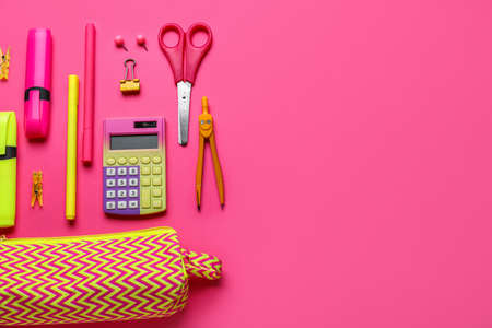 School stationery colorful paint pencils and pens on pink background in form of a frame, the concept of back to school