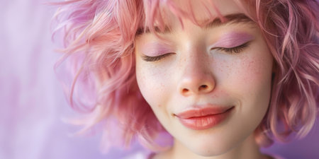 Attractive female with pink hair, stylish haircut, dressed in pink t-shirt, closeup