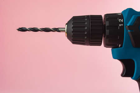 Home renovation pink drill on blue background. Image with copy blank space.