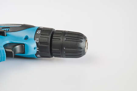 cordless electric drill close-up on a white background.