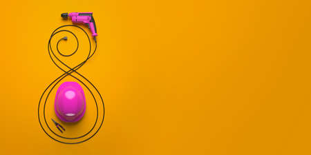 Embracing the significance of women's contributions on Labor Day. Overhead image showcasing a yellow helmet and construction tools on a pink isolated background, with copy-space for text or ads