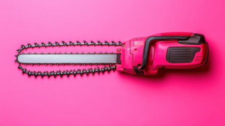 This vivid pink electric chainsaw stands out against a matching background, perfect for showcasing energy in home improvement projects or gardening.