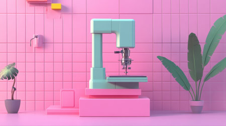 This image features a modern sewing machine set against a vibrant pastel backdrop, accompanied by decorative plants and geometric elements, perfect for creative spaces.