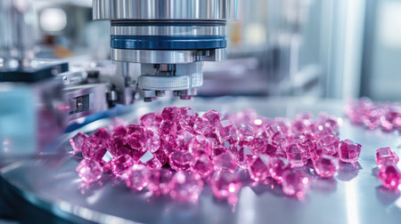 A close-up view of vibrant pink crystals being processed in a modern industrial setting, showcasing advanced machinery and precision technology.