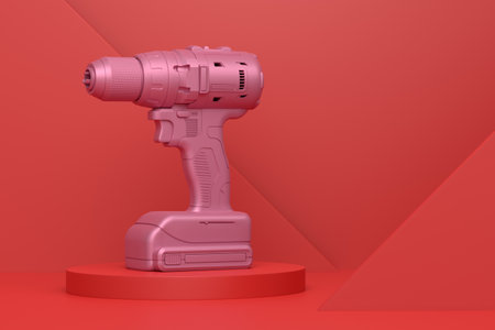 Abstract scene or podium with electric drill on monochrome background. 3d render of scene for product presentation carpenter tool for repair and building on stage, pedestal or platform