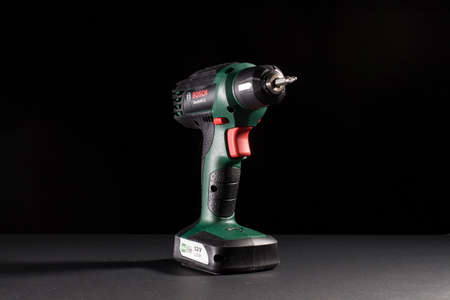 Milan, Italy - February 9, 2020: close up on a Bosch electric screwdriver, resting on a black background. No people are visible.