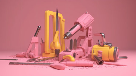 3d rendering of construction tools in pink background with space for text