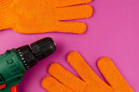 Handheld power tools, repair services, or home handyman. Electric drill and redwork gloves on a purple background. Copy space. Flat lay.