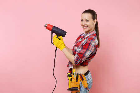 Young beautiful fun handyman woman in plaid shirt, denim shorts, kit tools belt full of variety instruments holding power heat gun isolated on pink background. Female in male work. Renovation concept