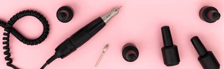 Flat lay top view equipment for manicure on pink background