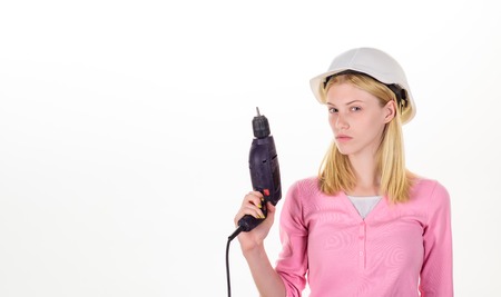 Woman in helmet using drill. Woman holds electric drill. Girl in construction helmet with drill in hand. Building, repair, interior design, renovation and home concept. Woman with electric screwdriver
