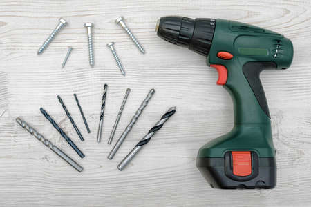 A green electric drill, several twisted drill bits and bolts placed on a white wood background.