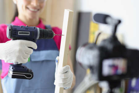 Happy woman construction site worker use drill to make hole in wooden plank