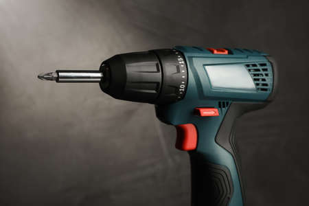 Modern electric power drill near black wall, closeup