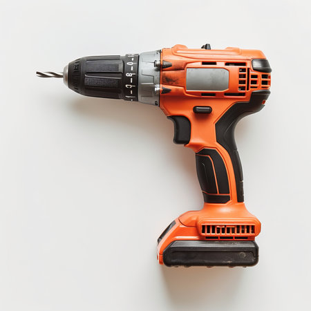 cordless power drill with orange and black design for repair projects isolated on white background