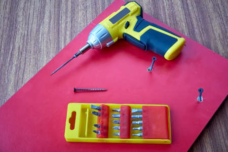 Cordless screwdriver with a set of nozzles on a red board, DIY repair