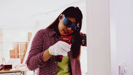 Female carpenter using drill to screwing wall at site.