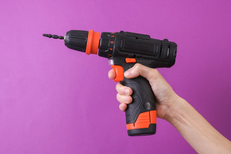 Female hand holding cordless screwdriver on purple background