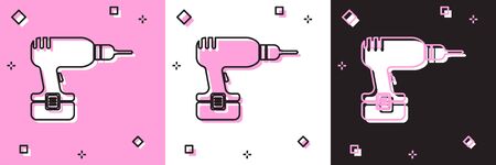 Set Drill machine icon isolated on pink and white, black background. Vector Illustration