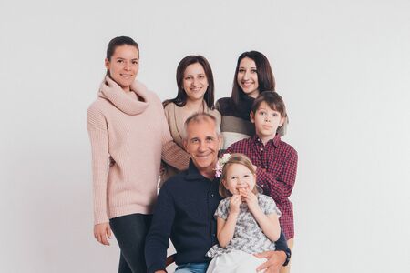 A beautiful family on studio white background