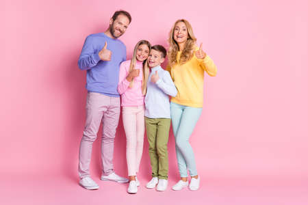 Full length photo of positive family mom dad and two small kids show thumb up sign isolated on pastel color background