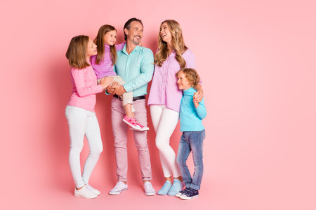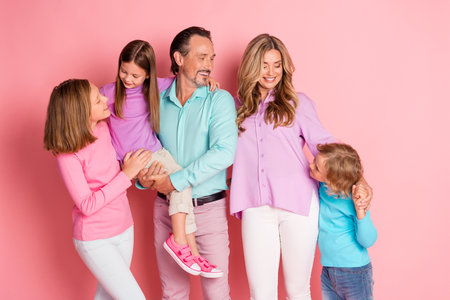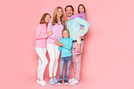 Joyful family portrait of parents children and teens posing together in pastel outfits against pink background showing love bonding and happiness