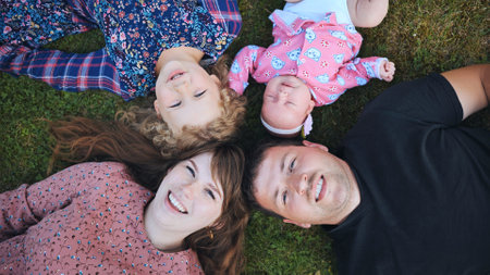 Happy family of four lying together in a circle on lush green grass, enjoying a joyful family day filled with love and laughter