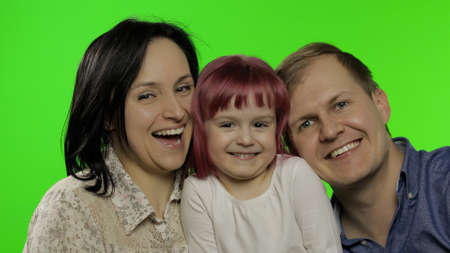 Happy family of three mom, dad, cute child little daughter embracing laughing kissing looking at camera, smiling parents with kid girl having fun hug enjoy communication warm relationships. Chroma key