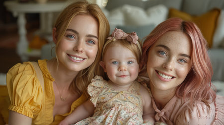 Lesbian couple kissing daughter. adopted or natural child of a same sex couple. AI generated