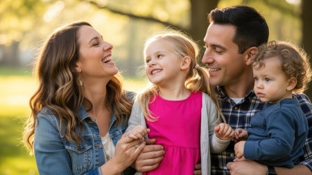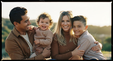 A family of four is depicted in a natural outdoor setting, bathed in warm sunlight. The image features a smiling mother, father, and two young children. The composition is a medium shot with a soft focus background. This family portrait could be utilized for various commercial purposes and editorial content.