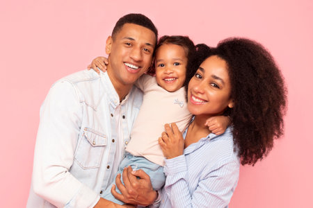 Loving black parents and little daughter sharing warm embrace, father, mother and female kid smiling at camera, standing over pink background