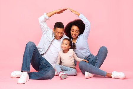 Family care concept. African American parents making symbolic roof of hands above their little daughter, sitting together on pink studio background