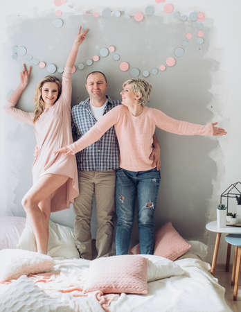 father with daughter and daughter in room decorated with flowers, closeup