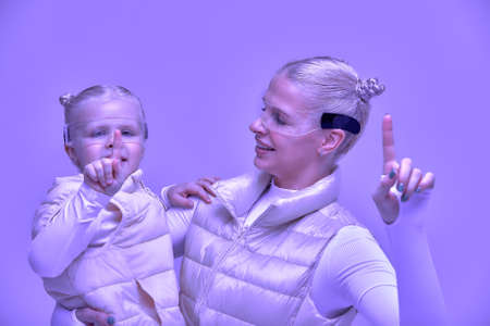 young woman with little girl wearing head mount display and futuristic GUI, smart glasses, graphical user interface, heads up display, Internet of Things. Neon light.