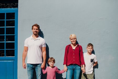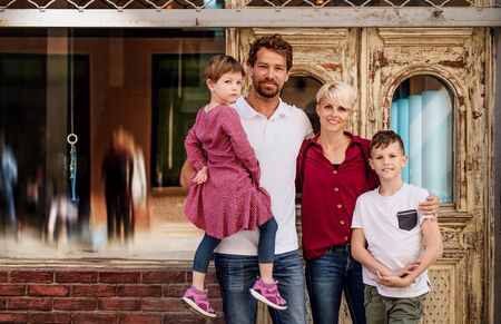 Front view of young family with two small children standing outdoors in town.