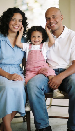 A beautiful portrait of a happy young family. A smiling mother, father, and their cute daughter sit together, looking at the camera in a sweet, synchronized pose.