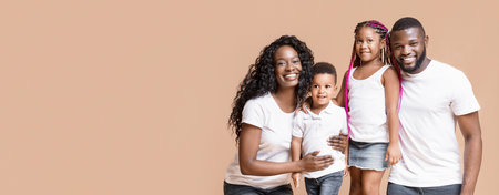 Cheerful african american family of four, standing one behind other and smiling at camera on pink background, banner, free space.