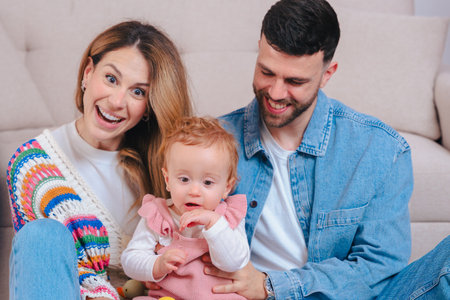 Happy young family sitting together with baby smiling at home looking at camera