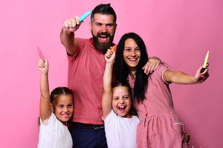 Family portrait. Parents and their children. Over dark pink.