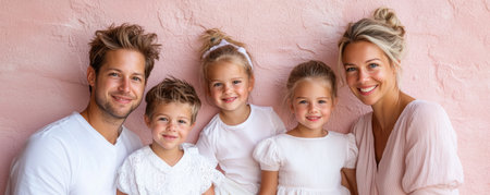 Joyful family portrait of parents and children smiling together against a pink background celebrating love and togetherness