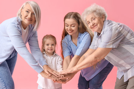 Little girl with her family putting hands together on pink background