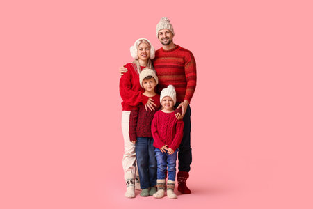 Happy family with children in winter clothes on pink background