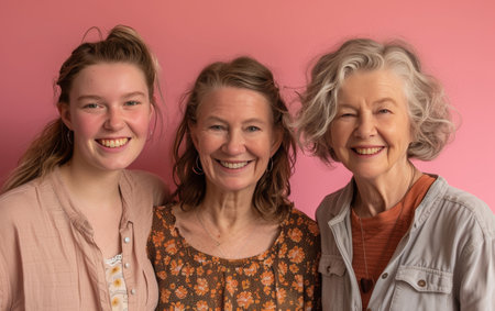 Portrait of three generations of women smiling in front of a pink background, depicting a young woman, her mother, and grandmother