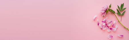 top view of floral petals near fresh peony on pink background, banner
