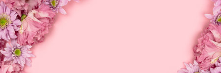 Banner with eustoma and aster flower texture on a pink pastel background. Springtime concept with copyspace. Floral frame.