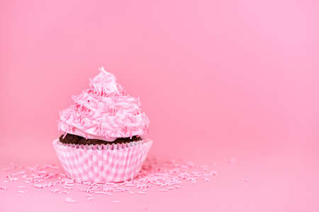 birthday cupcakes with whipped cream icing and decorated sprinkles on pink background, concept of baby party